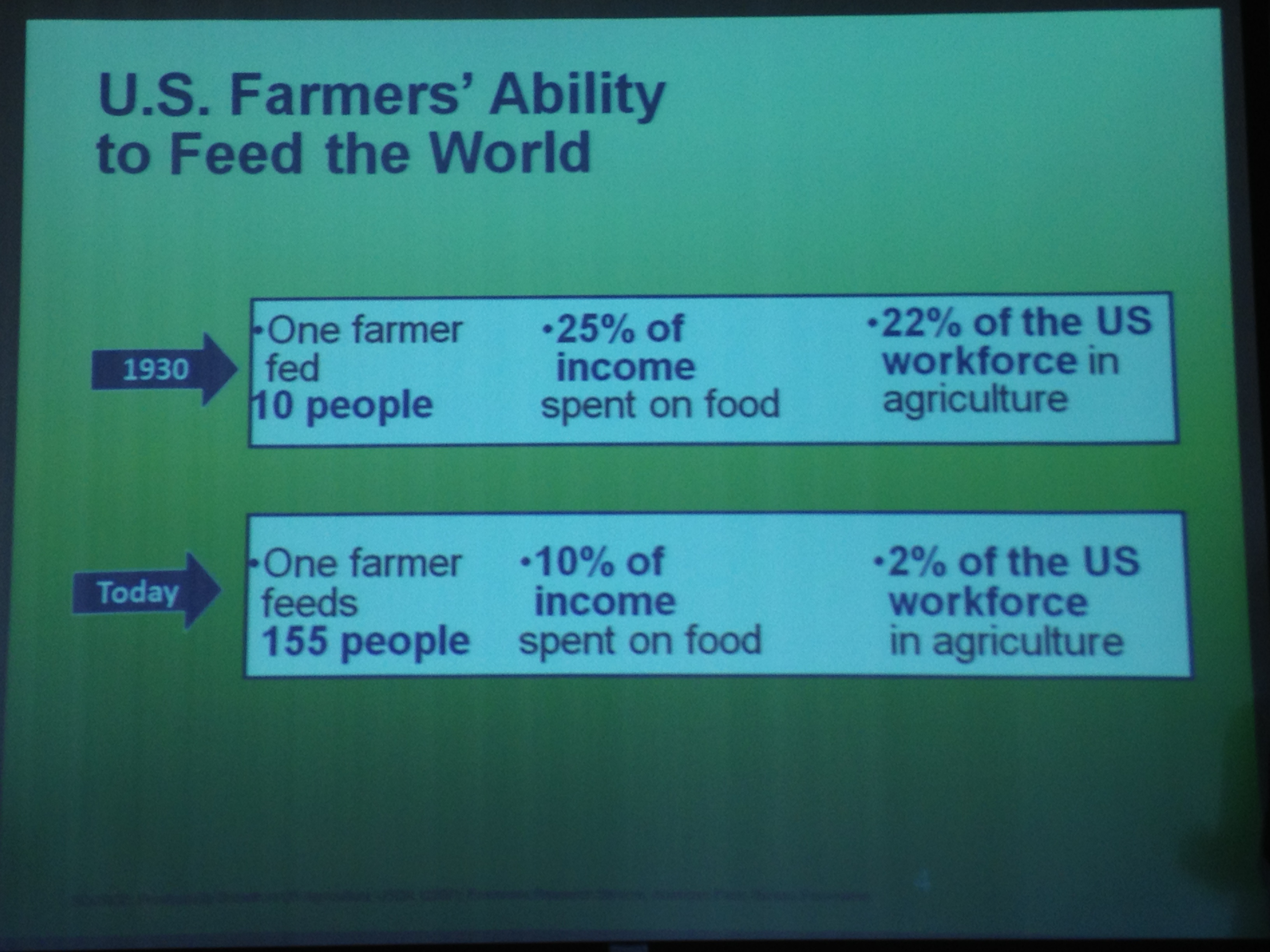 One of the slides that really grabbed our attention was one that talked about food production on farms and the changes in productivity in one generation’s time. The slide said that in 1930 a farmer fed 10 people, Americans’ spent 25% of our income on food and 22% of the US workforce was employed in agriculture. Today (it pointed out) that a farmer produces food for 155 people, we spend an average of 10% of our income on food and just 2% of America is engaged in agriculture. Wow.
