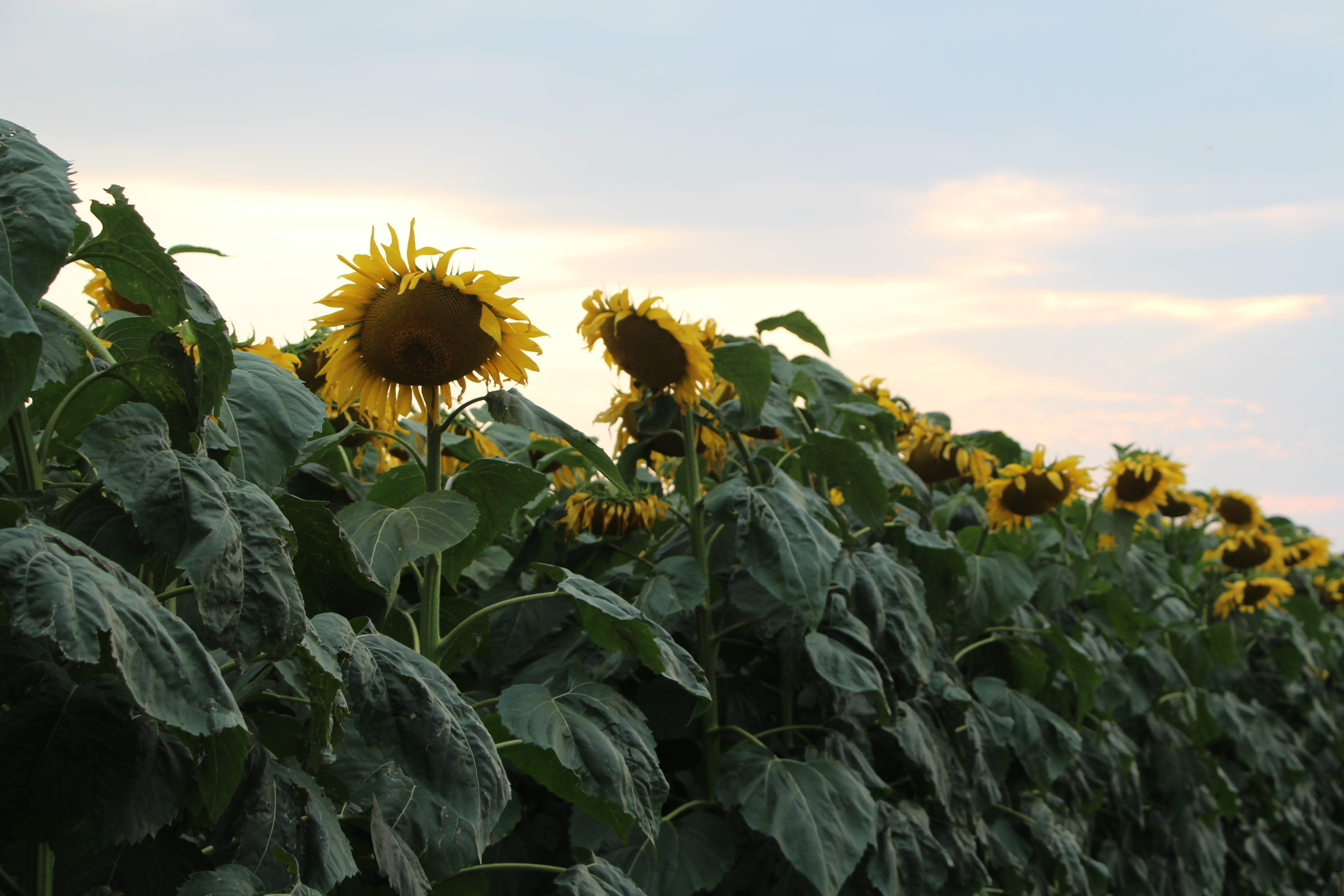 The sunflowers turn from east facing to southern facing here during the day. Never completely turn west. They regain position during the night to face east once again for the sunrise!