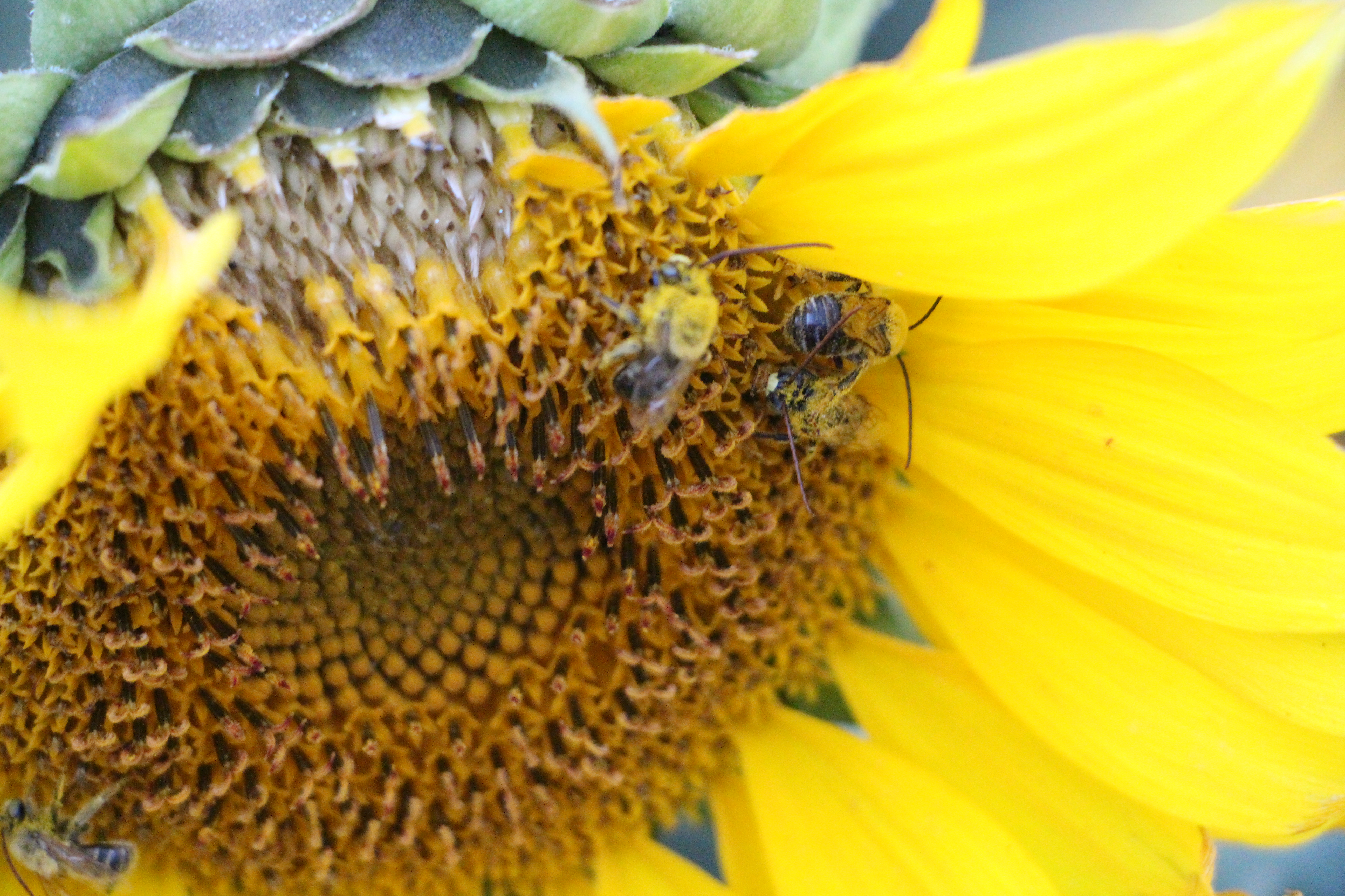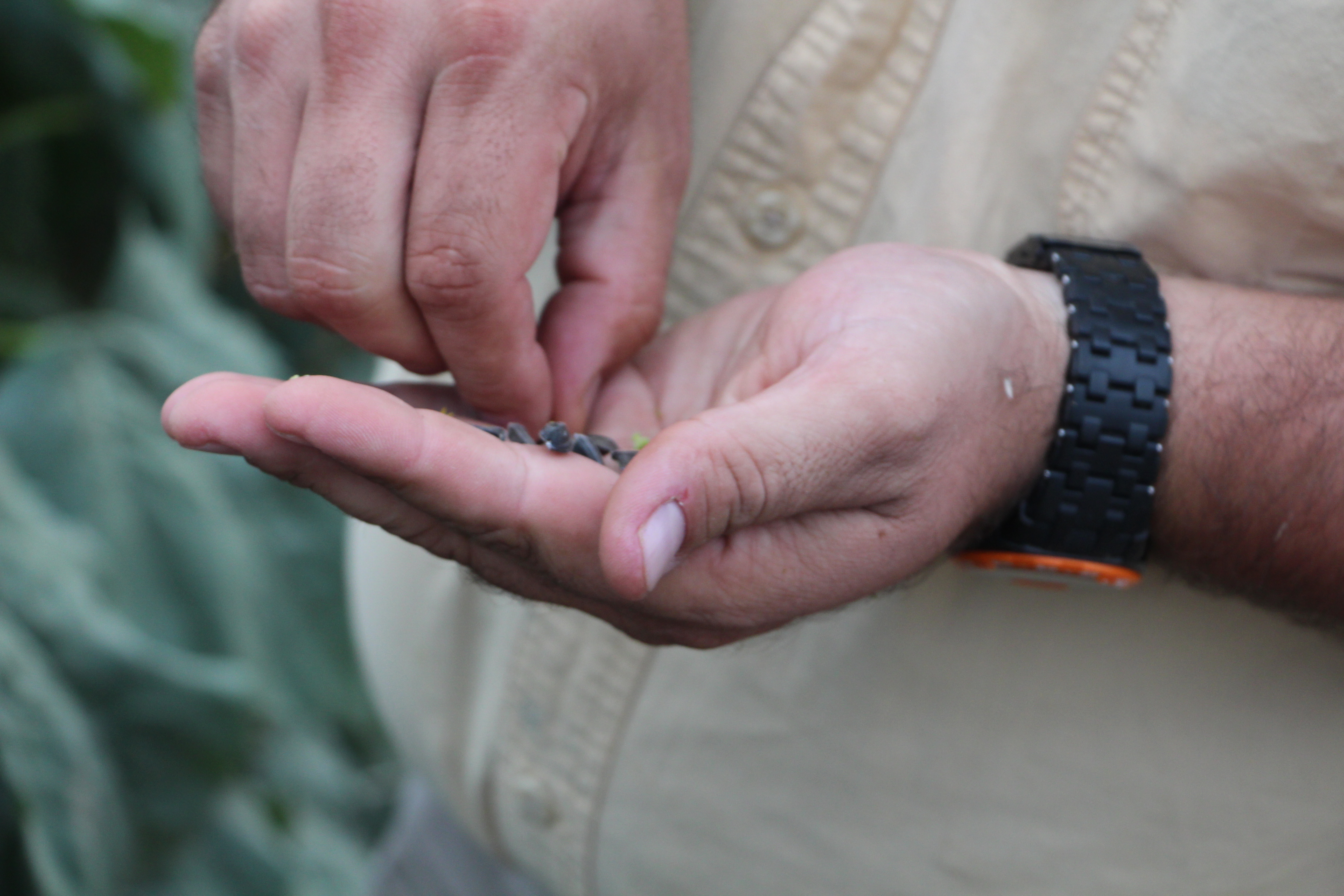 The flowers almost always, when they are at peak color have lots of bees on them. The well, the part farmers are interested in are the seeds underneath that pollen. You can see in the above photo on the right, Mark is just brushing the pollen off with his hands. Once that happens, you can see the sunflower seeds really clearly. And Mark pulled a few of those to inspect them as well!