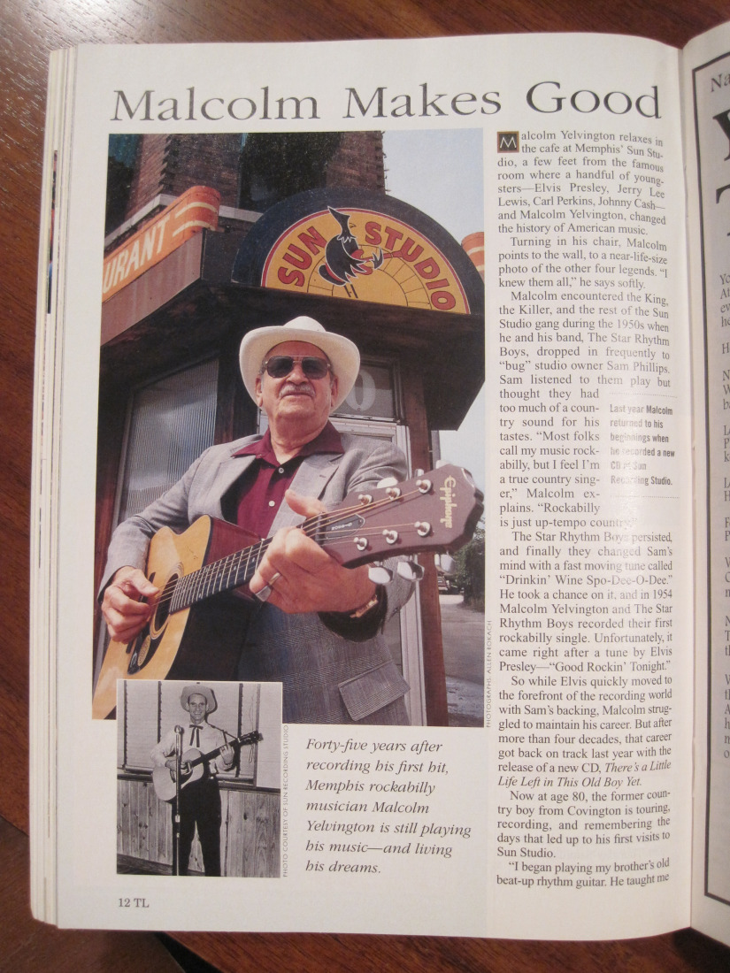 There were several more times he was in the limelight. One that I pulled out today is a 1999 issue of Southern Living that featured a one page article on him. (All this came to mind after my cousin checked to made sure I had Mac’s CD “There’s a Little Life Left in This Old Boy Yet” on my iPod — by the way, why isn’t it among the options for Malcolm Yelvington on iTunes?) And I have another magazine that came from Europe that had an article or two on Uncle Mac. He brought me a couple from one of his tours. That’s safely tucked away but since I moved recently, I can’t be sure where the new safe place is LOL!