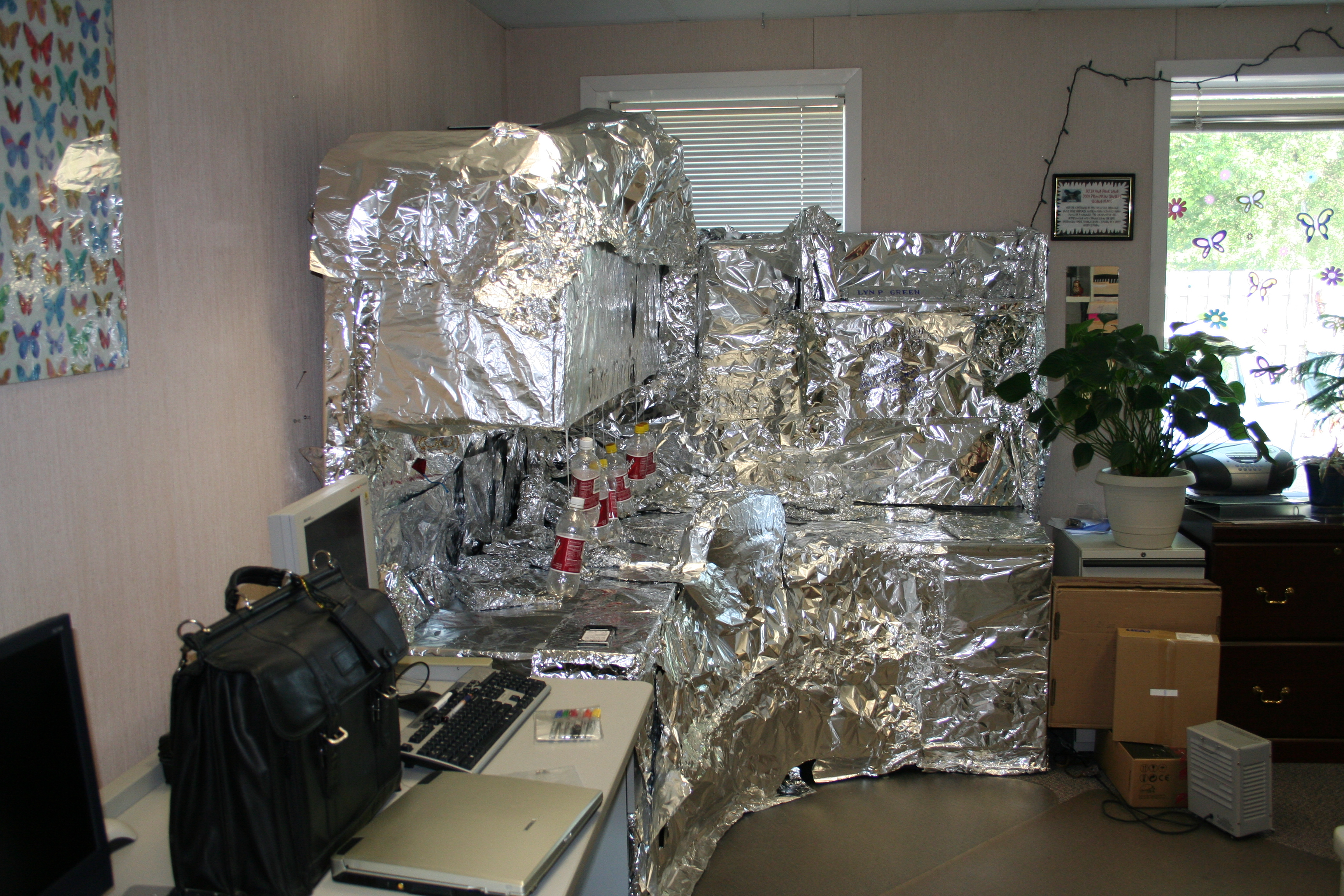 Stumbled on this set of photos and thought it makes a PERFECT wordless Wednesday post! It was an office prank that was done as a coworker was out of town on her honeymoon. All good fun and a lot of the foil was recycled. 🙂