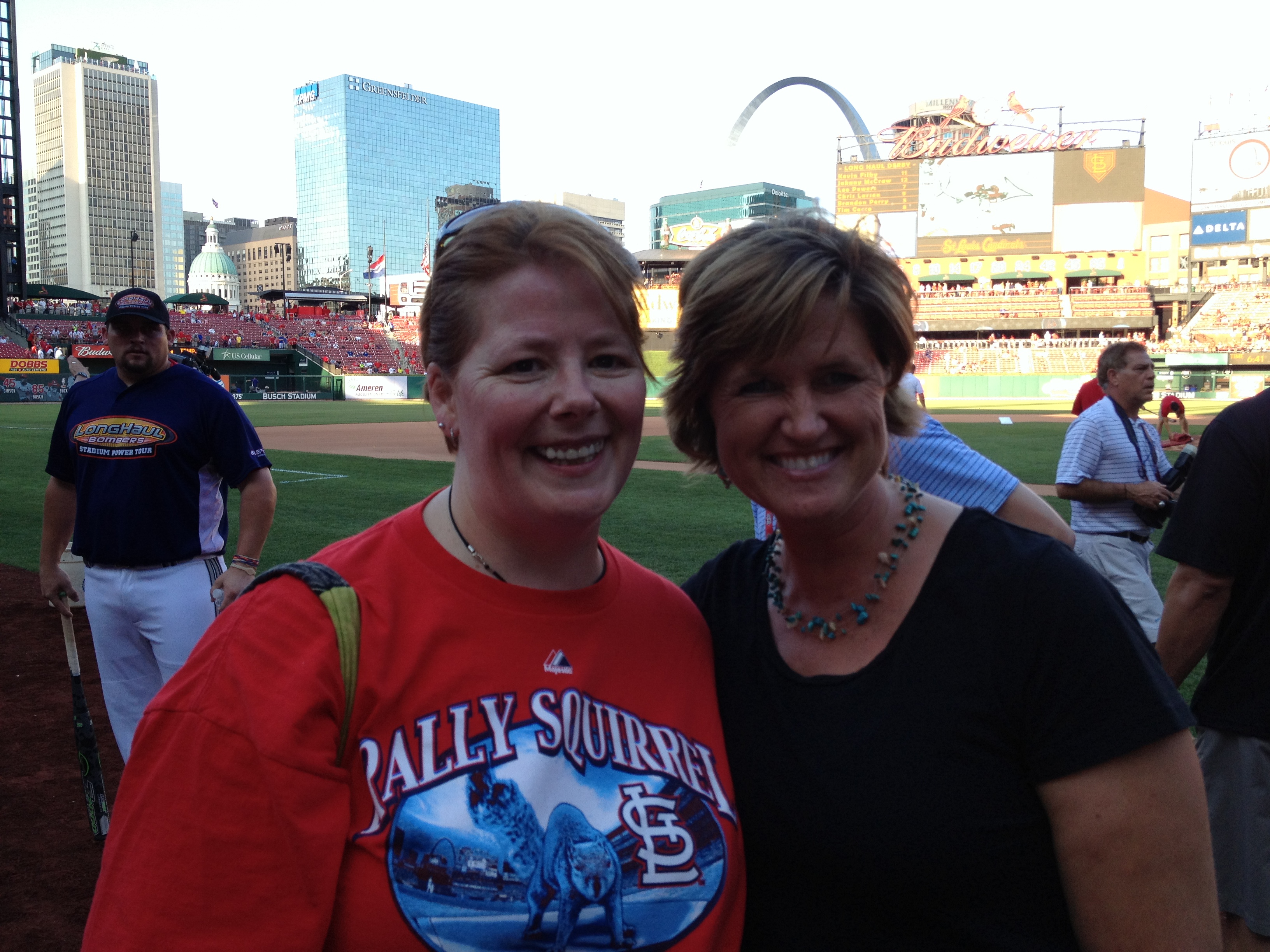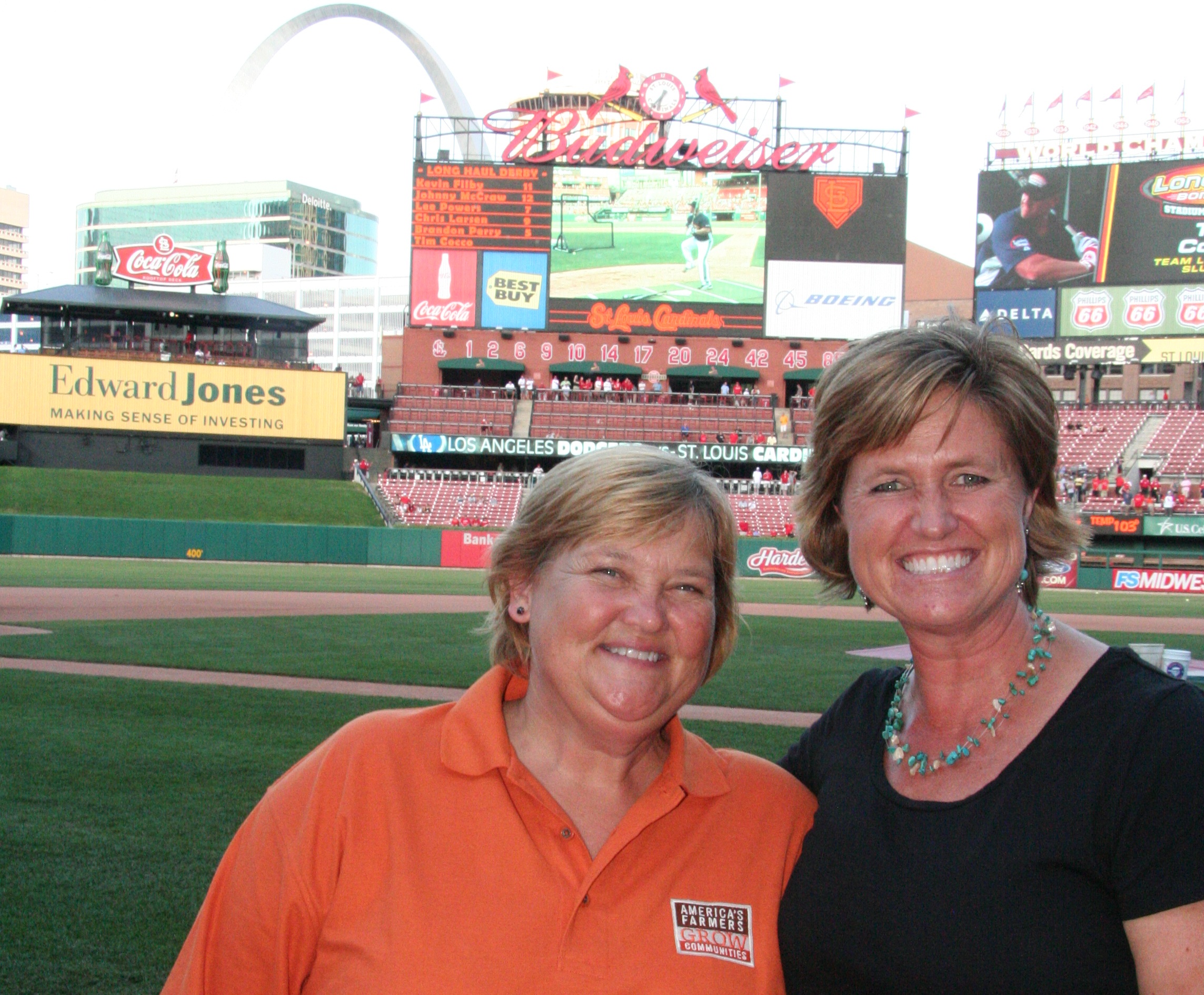I’ve noticed the farmers who get honored at several games. The Cardinals put them up on the big screen. Sometimes it’s a dairy farmer presented by the local dairy distributor other times its a hog farmer (remember Chris Chinn was spotlighted last year). Well Wednesday night, I got to be ON THE FIELD as my good friend Debbie Lyons-Blythe (who showed Jake’s Flat Stanley around her ranch) was interviewed about her farm. As soon as she finished, my new friend April Hemmes from Hampton, Iowa took the spotlight. INCREDIBLE women. (You can learn more about Debbie & her farm on the farm mom page or on her blog Life on a Kansas Cattle Ranch. You can learn more about April’s farm on the America’s Farmers site.)