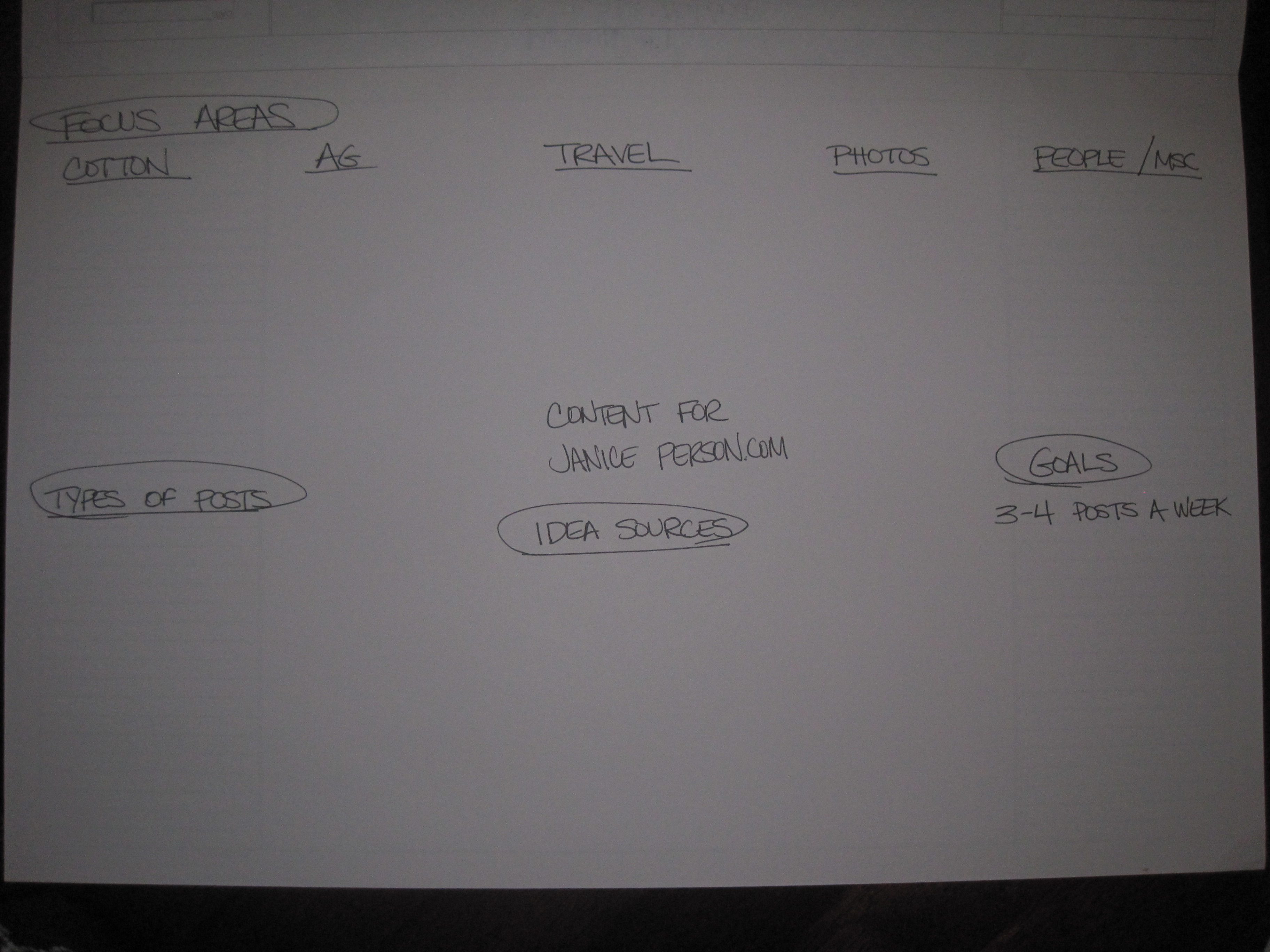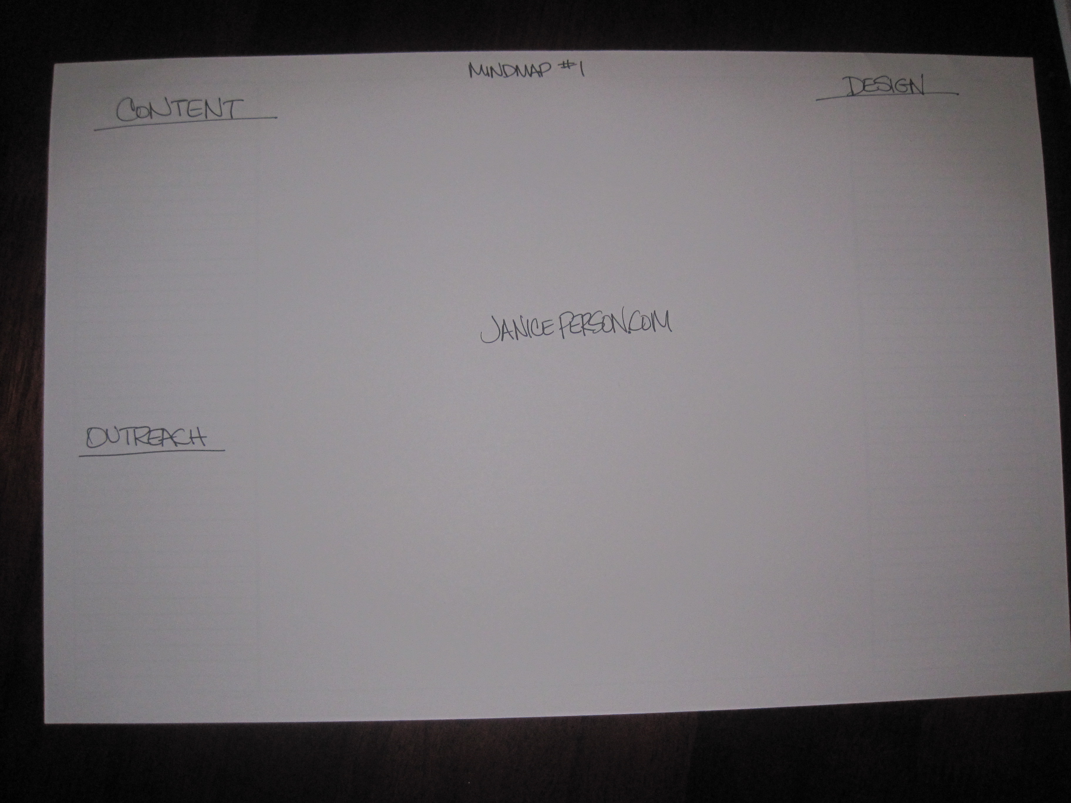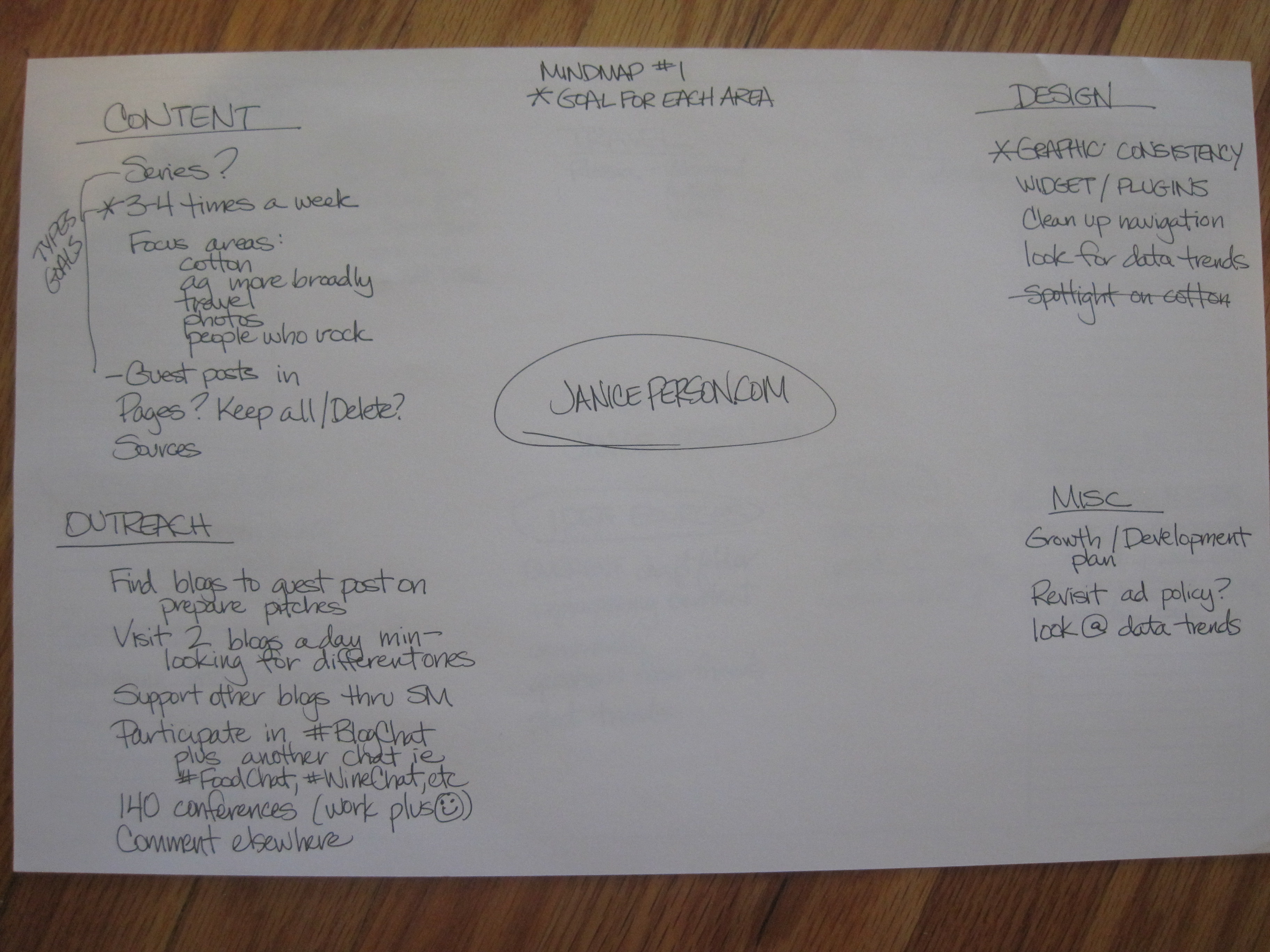 I take a sheet on my desk blotter put janiceperson.com in the middle and start putting buckets for ideas in various areas of the sheet. The areas I chose for the overall mindmap became: content, design, outreach & misc. With the addition of some depth in each area: