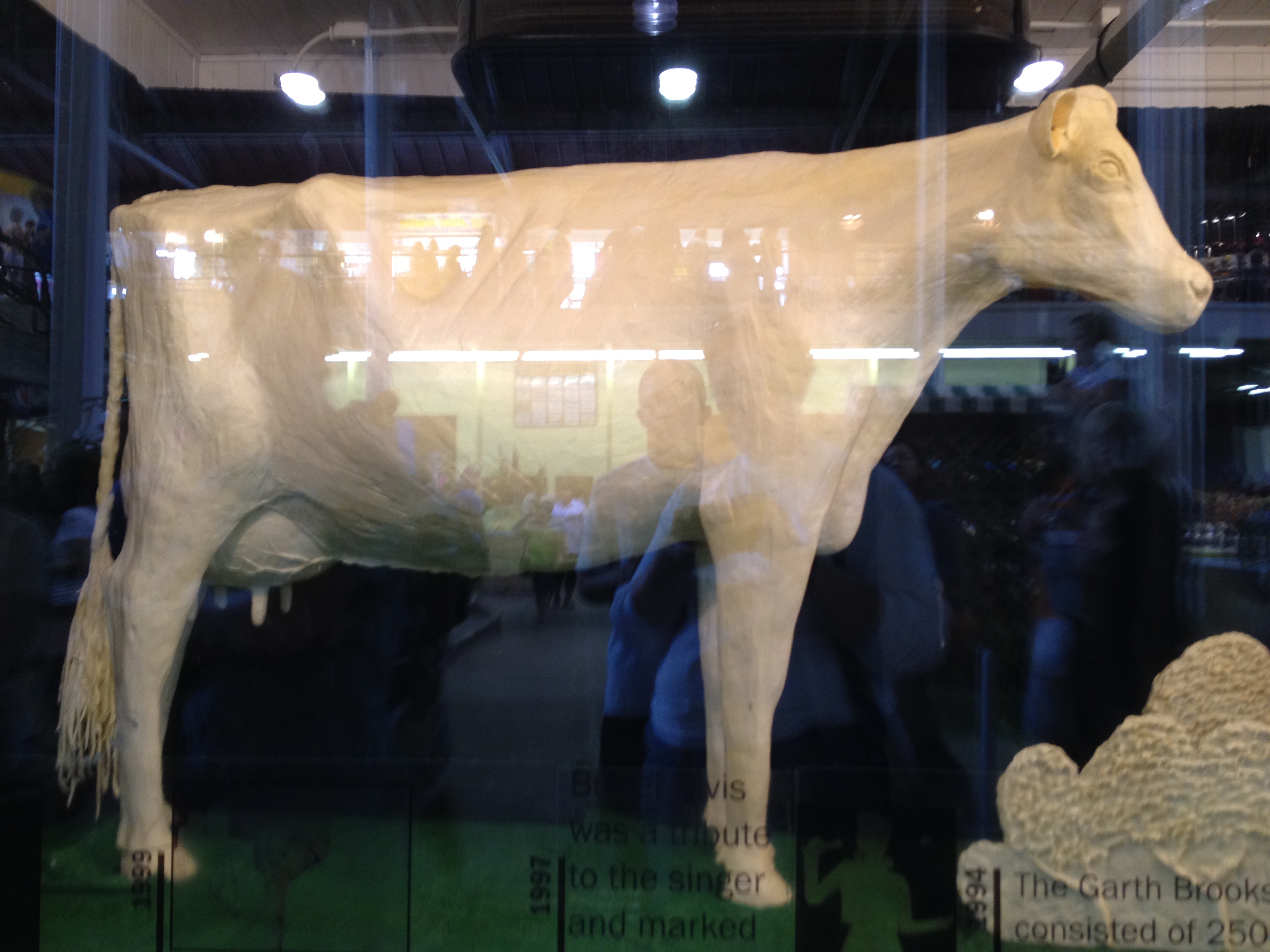 Simply put, the fair has a butter sculptor who sculpts a butter cow and a companion sculpture of some sort every year. The butter cow gets its shape from the wire base that butter is put on top of. It is life size too! Here’s how the Iowa State Fair explains its make up: