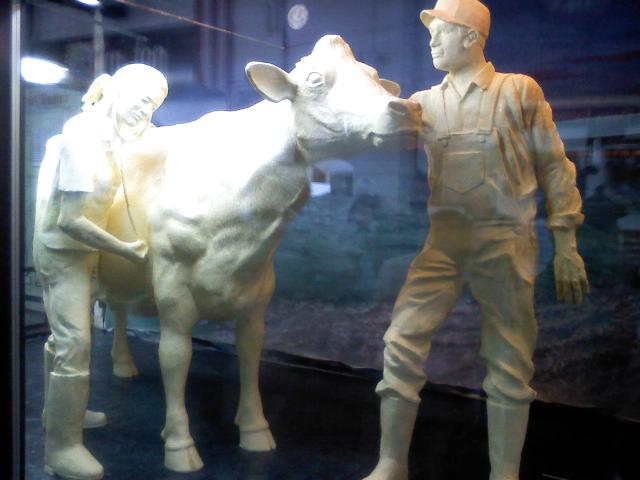 Several years ago, when I first heard about butter cows, it was through the enthusiasm of a friend — Mike Haley who later spurred the great butter-lard debate of 2010 about cookies — who couldn’t wait it see that year’s at the Ohio State Fair. I still remember asking him a million questions. Eventually he sent me a photo of the butter cow and I seem to remember a football player sculpture too. Thanks to Google, I can show you that sculpture from 2009 — it was the cow, farmer and a vet!